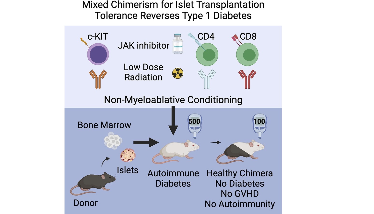 Điểm quan trọng giúp phương pháp này khả thi là phác đồ “tiền điều kiện” rất nhẹ nhàng trước ghép. Thay vì sử dụng hóa trị hoặc xạ trị liều cao như trong ghép tủy cổ điển, các nhà nghiên cứu chỉ dùng chiếu xạ liều thấp kết hợp với các kháng thể nhắm trúng đích để dọn đường chọn lọc cho tế bào gốc mới. Phác đồ này đủ mạnh để tạo chỗ cho hệ miễn dịch lai hình thành nhưng đủ dịu để hạn chế độc tính, một yếu tố quan trọng nếu muốn chuyển giao chiến lược này sang điều trị bệnh tự miễn ở người.