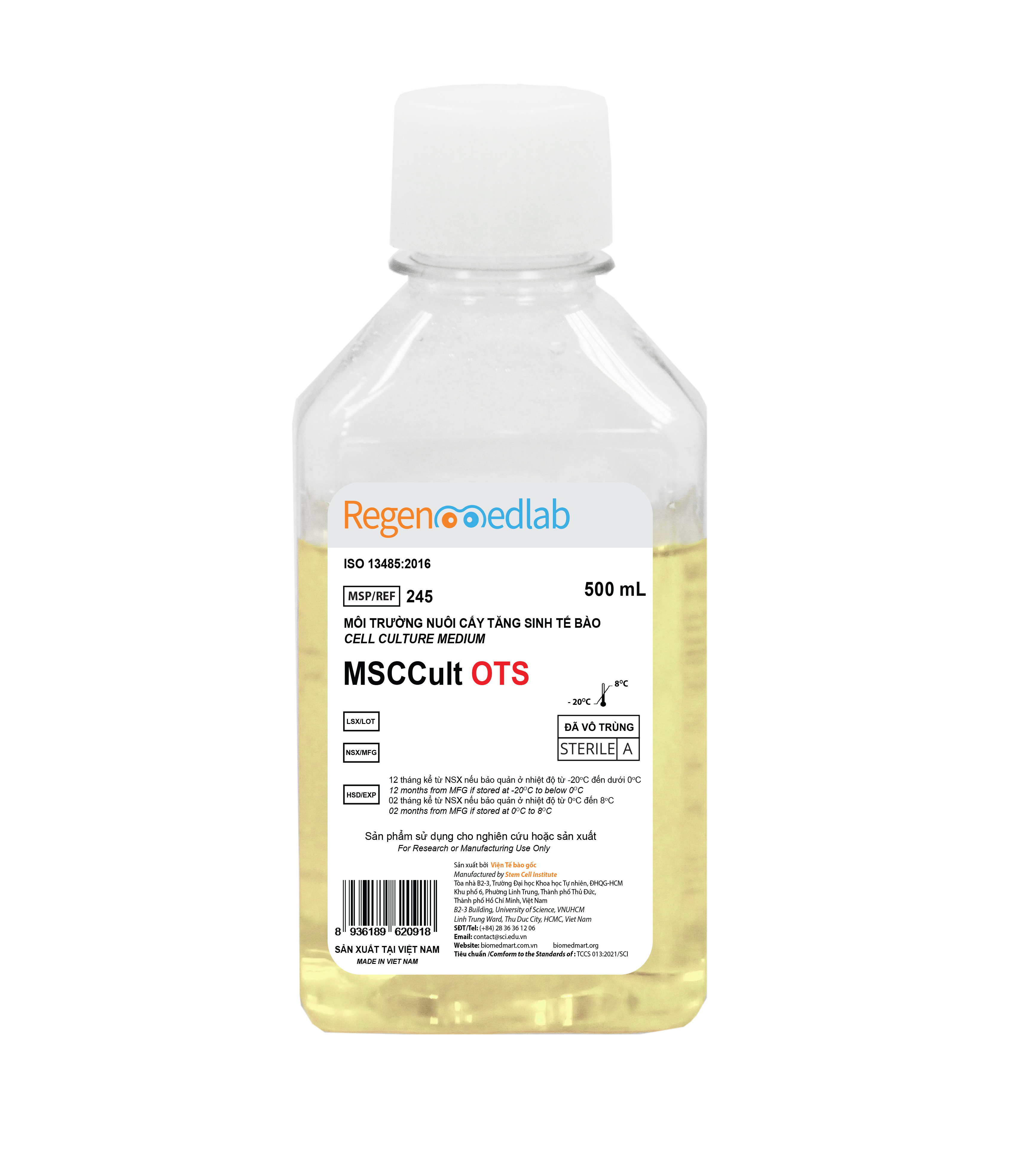 MSCCult OTS với công thức tiên tiến, không sử dụng phenol red, không sử dụng bất kì thành phần protein động vật nào, hàm lượng nội độc tố thấp, thích hợp cho việc tăng sinh tế bào gốc trung mô từ nhiều loại mô khác nhau. Sản phẩm phù hợp với các dây chuyền sản xuất thuốc tế bào gốc trung mô.