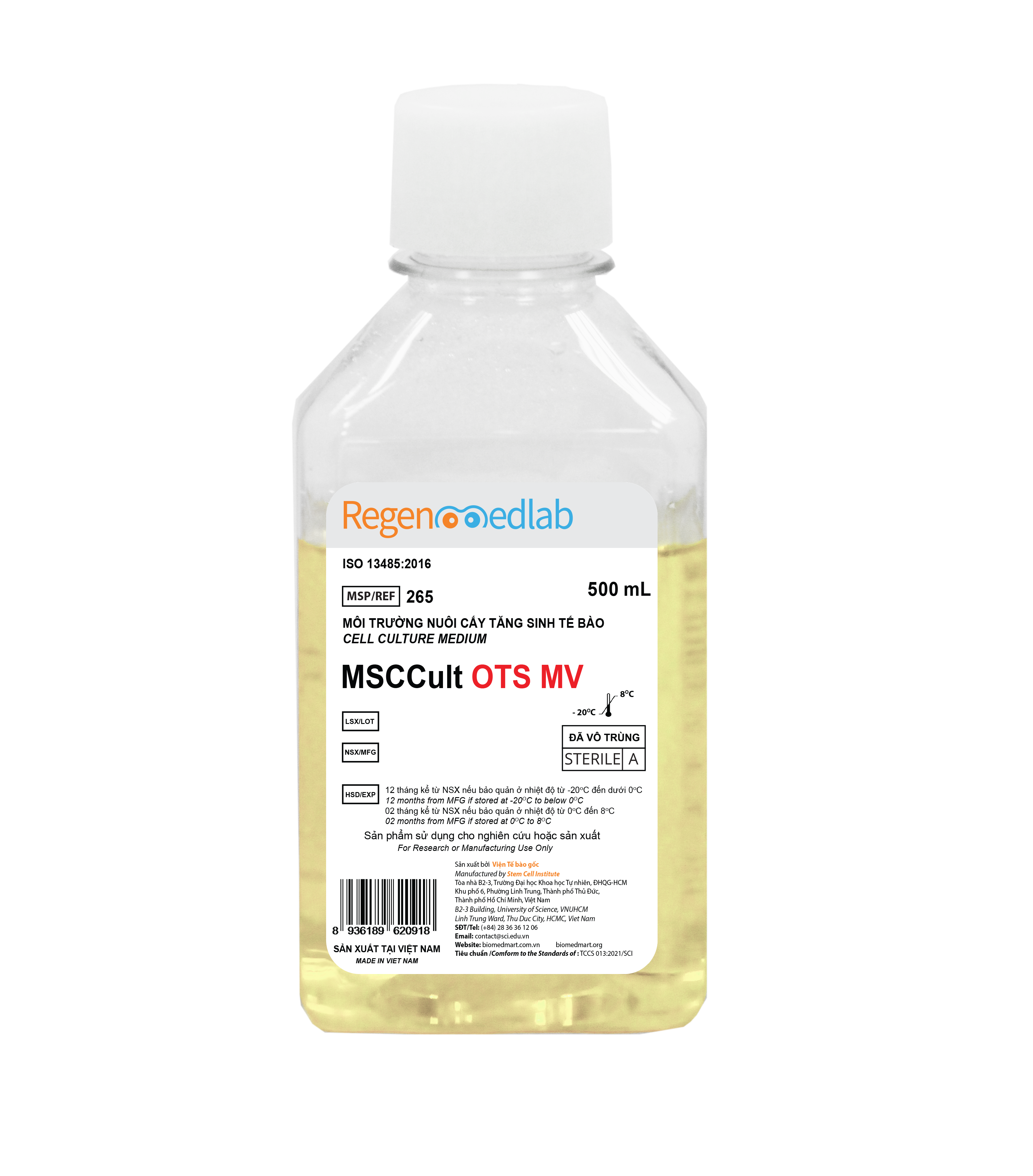 MSCCult OTS MV là sản phẩm với công thức tiên tiến, không sử dụng phenol red và bất kì thành phần protein động vật nào. Hàm lượng nội độc tố thấp, thích hợp cho sản xuất dịch tiết (conditoned medium), túi tiết (microvesicle) và exosome từ nhiều nguồn tế bào gốc trung mô khác nhau.